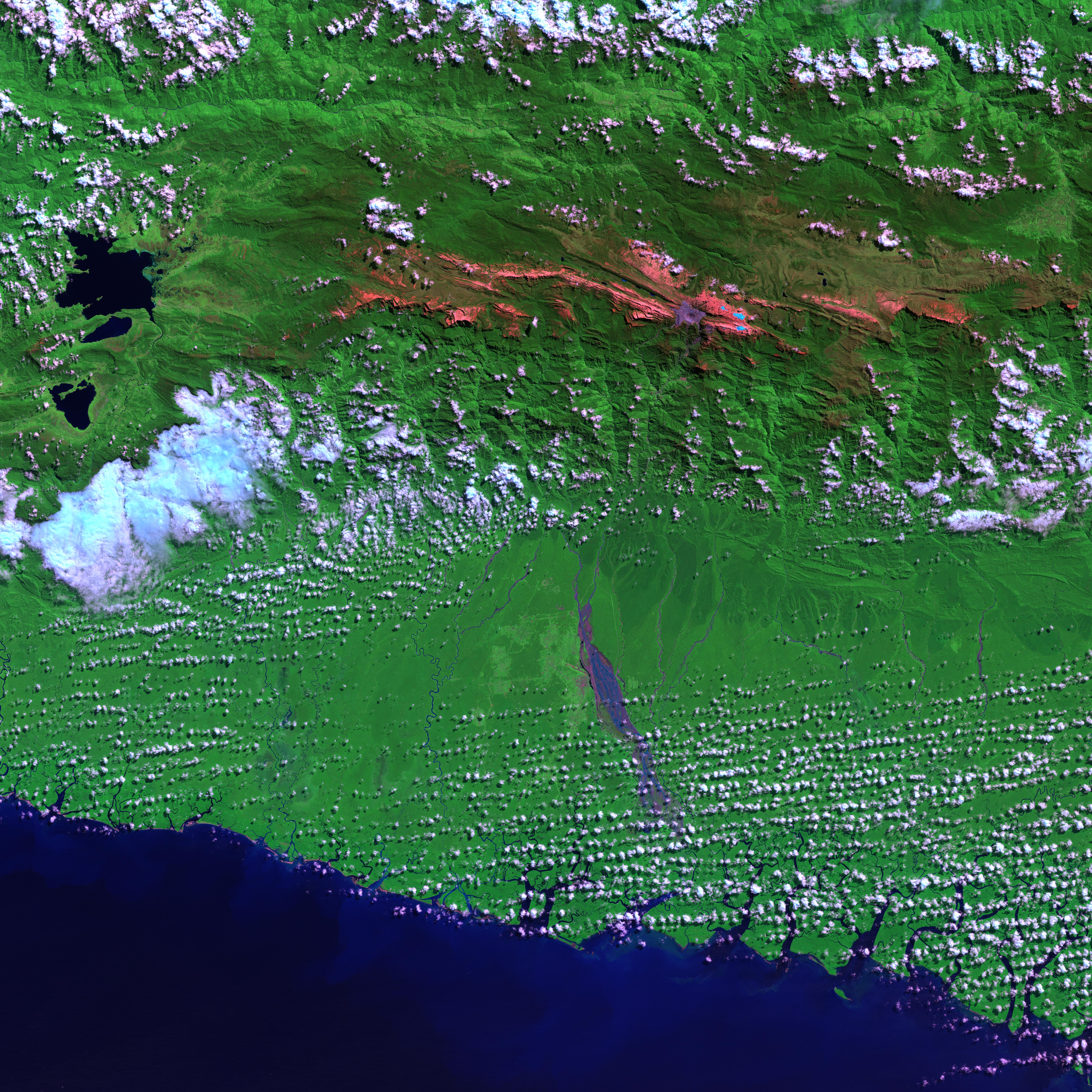 ภาพถ่ายดาวเทียมนี้ถ่ายโดยดาวเทียมแลนแซทในวันที่ 29 พฤษภาคม 2003 หิมะและน้ำแข็งในภาพจะปรากฎเป็นสีฟ้า ส่วนเมฆจะเป็นสีขาว พื้นผิวที่ไม่มีพืชพรรณปกคลุมเช่นแนวเขาหินปูนจะปรากฎเป็นสีแดงหรือชมพู ส่วนสีม่วงเข้มหรือเทาคืพื้นที่เหมืองทองแดงแบบเปิดหน้าดิน ส่วนพื้นที่ป่าเขตร้อนและทีลุ่มต่ำปรากฎเป็นสีเขียว ในภาพยังปรากฎให้เห็นน้ำที่ไหลบนพื้นผิวลงสู่แม่น้ำทางด้านใต้ของเหมืองทองแดงซึ่งปรากฎเป็นสีม่วงเข้ม ส่วนใหญ่คือเศษหินและดินที่ถูกชะล้างจากการทำเหมือง