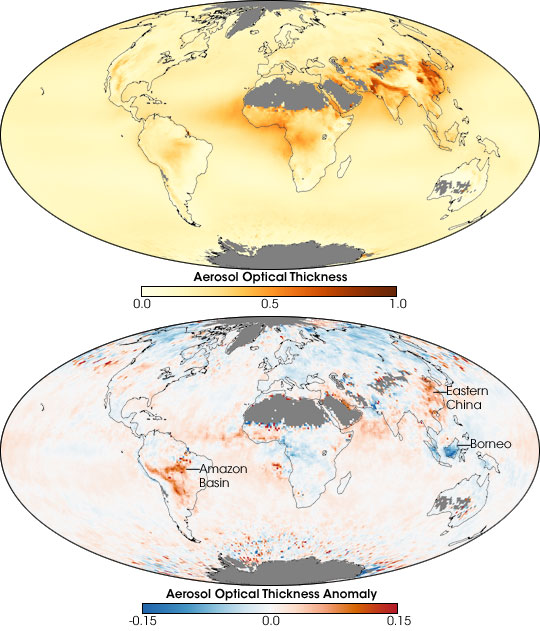 นับตั้งแต่ปี 2543 เป็นต้นมา เครื่องมือ Moderate Resolution Imaging Spectroradiometer (MODIS) บนดาวเทียม Terra ขององค์การนาซาได้ทำการวัดแบบแผนของละอองลอย(aerosols) ซึ่งหมายถึงอนุภาคขนาดเล็กแขวนลอยในอากาศ ทั้งนี้เพื่อช่วยให้นักวิทยาศาสตร์เข้าใจถึงอิทธิพลอันสลับซับซ้อนที่ “ละอองลอย” มีต่อภูมิอากาศโลก แผนที่โลกเปรียบเทียบให้เห็นแบบแผนการกระจายตัวของละอองลอยทั่วโลกในช่วงปี 2543-2550 (ภาพบน) และค่าเฉลี่ยของละอองลอยในปี 2550(ภาพด้านล่าง)