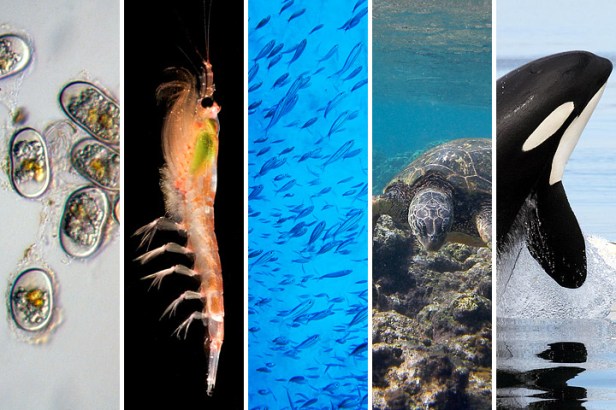 Algae such as Alexandrium tamarense (left) harness sunlight to make food for themselves, then become food for everything from krill, fish, turtles, and whales. (Photographs © WHOI, WHOI,Wiborg, deeje, and *christopher*)