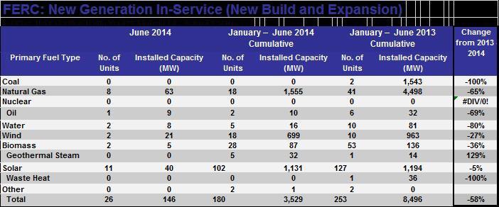 ตัวเลขใหม่ของคณะกรรมการกำกับกิจการของรัฐบาลสหรัฐฯ ออกมาแล้ว กำลังการผลิตไฟฟ้าใหม่ลดลงร้อยละ 58 ในเดือนมิถุนายน 2557 นี้เมื่อเปรียบเทียบกับเดือนมิถุนายนปีที่แล้ว
