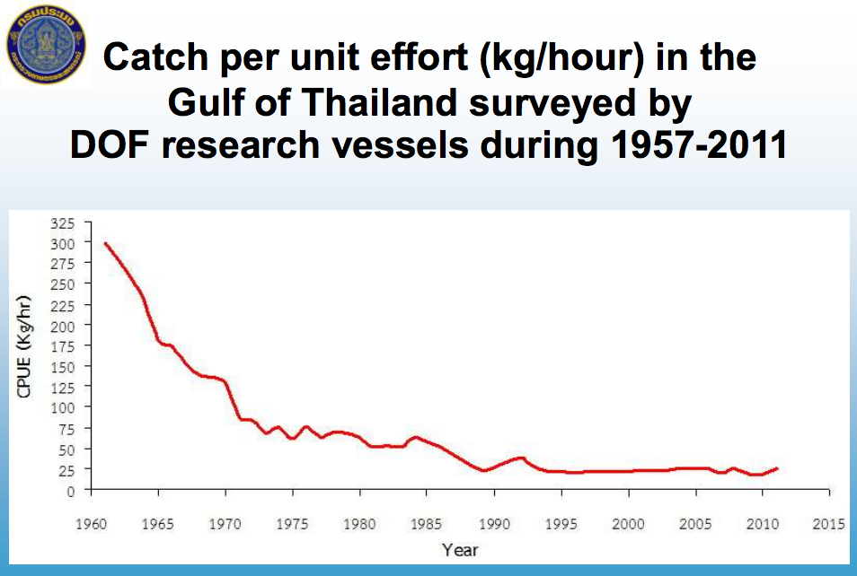 ประเทศไทยเปลี่ยนมาเป็นการประมงทะเลที่จับปลาตัวเล็ก(trash fish) และการเพาะเลี้ยงชายฝั่ง(aquaculture) ด้วยเหตุที่ว่าการประมงพาณิชย์ได้ทำการกวาดล้างพันธุ์สัตว์น้ำ เป็นการประมงเกินขนาดที่จับเอาพันธุ์ปลาพื้นถิ่นอันมีคุณค่าทุกสายพันธุ์ ขึ้นมาหมด (pdf, p.16, 36):