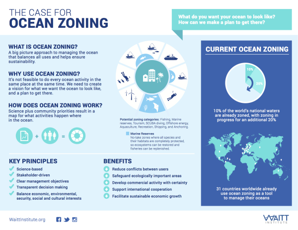 #5 การจัดพื้นที่มหาสมุทร(Ocean zoning)เป็นประเด็นด้านการจัดการที่ได้รับความสนใจ กว่า 30 ประเทศนำเอา ocean zoning เป็นเครื่องมือในการจัดการ ล่าสุดคือ Blue Halo Initiative ในบาบูดา(Barbuda) โดยมีสถาบัน Waitt ร่วมมือกับรัฐบาลท้องถิ่นพัฒนาแผนการจัดการแบบองค์รวมในเขตทะเล หลังจากกระบวนการปรึกษากับชุมชนกว่า 17 เดือน เป็นผลให้เกิดแผนที่ทางทะเลที่รวมเอาการปกป้องเขตชายฝั่งทะเลร้อยละ 33