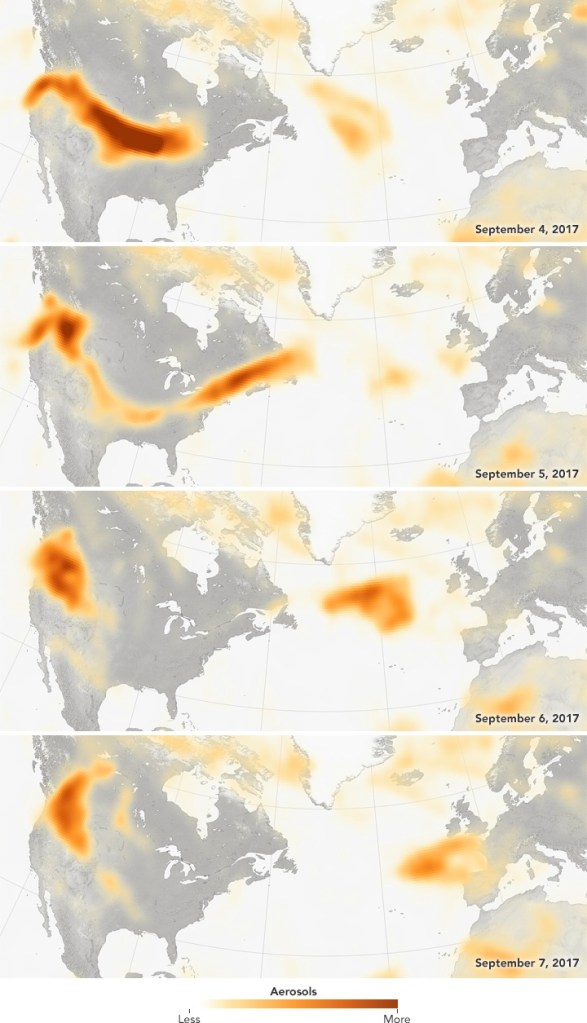 Colin Seftor นักวิทยาศาสตร์ด้านบรรยากาศที่ทำงานให้กับ Goddard Space Flight Center ของ NASA กล่าวว่า “คุณจะเห็นได้ว่ากลุ่มละอองลอยในวันที่ 6 กันยายนเป็นส่วนหนึ่งของกระแสละอองลอยที่หลุดออกมาจากแถบแปซิฟิกตะวันตกเฉียงเหนือ เหมือนว่าละอองลอยเดินทางข้ามมหาสมุทรแอตแลนติก”