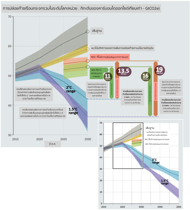 จากแผนภาพ เราจะต้องลดการปล่อยก๊าซเรือนกระจกให้เหลือ 42 กิกะตันของคาร์บอนไดออกไซด์เทียบเท่าต่อปีภายในปี ค.ศ. 2030(พ.ศ.2573) เพื่อให้สอดคล้องกับเป้าหมายที่จะป้องกันไม่ให้อุณหภูมิเฉลี่ยผิวโลกเพิ่มขึ้นเกิน 2 องศาเซลเซียส ในขณะที่ ข้อเสนอการมีส่วนร่วมที่ประเทศกำหนด(NDC) แบบมีการสนับสนุนภายนอก(Condition NDC)และไม่มีการสนับสนุนภายนอก(Uncondition NDC) นั้นนำไปสู่การลดก๊าซเรือนกระจกได้ 11 และ 13.5 กิกะตันของคาร์บอนไดออกไซด์เทียบเท่าภายในปี ค.ศ. 2030(พ.ศ.2573) ตามลำดับ