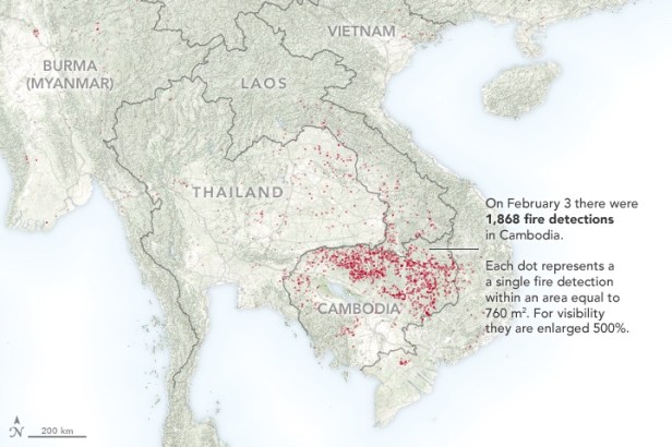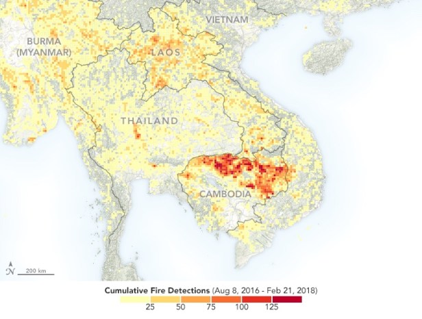 เครื่องมือ Visible Infrared Imaging Radiometer Suite (VIIRS) บนดาวเทียม Suomi NPP รวบรวมข้อมูลภาพถ่ายที่แสดงถึงจุดเกิดไฟหลายร้อยจุดในกัมพูชา เวียดนาม ไทย ลาวและเมียนมาร์ในวันที่ 3 กุมภาพันธ์ 2561 จุดสีแดงแต่ละจุดบนแผนที่ด้านบนแสดงถึงการตรวจพบจุดความร้อนในหนึ่งจุดโดยเครื่องวัด VIIRS 750-meter active fire data product (หมายเหตุ : ยังมีเครื่องวัด 375-meter active fire data product ที่มีขีดความสามารถตรวจสอบการเกิดไฟได้มากกว่า แต่ผลจากเครื่องมือ 750-meter นั้นก็เพียงพอสำหรับนำมาใช้ในการทำแผนที่)
