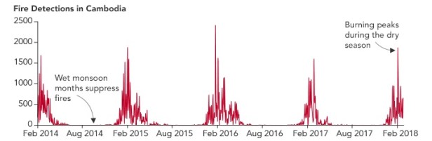 การเผาไหม้ในที่โล่งเกิดขึ้นได้จากหลายสาเหตุ นาย Evan Ellicott ผู้เชี่ยวชาญด้านรีโมตเซนซิ่งและการเกิดไฟแห่งมหาวิทยาลัยแมรีแลนด์กล่าวว่า “ถ้าไม่มีข้อมูลจากคนในภาคสนาม มันเป็นได้ยากที่จะรู้ว่าสาเหตุการเกิดไฟนั้นคืออะไรจากภาพถ่ายดาวเทียม แต่มีความชัดเจนมากว่า การตรวจจับจุดความร้อนจำนวนมากในกัมพูชาโดยภาพถ่ายดาวเทียมนั้นเชื่อมโยงกับพื้นที่ป่าไม้ที่สูญเสียไป(forest cover loss) ไฟที่เกิดมากขึ้นในแต่ละปี พื้นที่ป่าไม้ก็สูญเสียมากตามไปด้วย