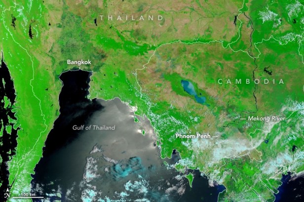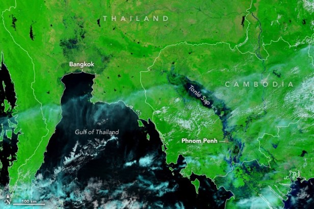 ฝนในฤดูกาลแห่งมรสุมทิ้งให้บางส่วนของเอเชียตะวันออกเฉียงใต้มีน้ำขัง ภาพแรกแสดงสภาพของพื้นที่ในไทยและกัมพูชาในวันที่ 4 พฤศจิกายน 2561 หลังจากน้ำไหลบ่าจากแม่น้ำและทะเลสาปและทำให้พื้นที่ลุ่มมีน้ำท่วมขัง ภาพที่สองถ่ายในวันที่ 10 เมษายน 2561 เปรียบเทียบให้เห็นความแตกต่างก่อนฤดูมรสุมจะเริ่มขึ้น