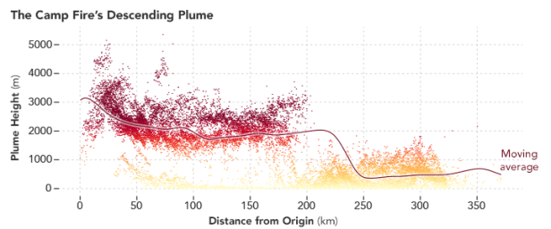 ในขณะที่เกิด ไฟป่า ลุกลามขยายตัวทางตอนเหนือของแคลิฟอร์เนียเมื่อวันที่ 9 พฤศจิกายน ปี พ.ศ.2561 ดาวเทียม Terra ได้เก็บข้อมูลภาพของกลุ่มหมอกควันไฟ และภาพจากเครื่องมือตรวจวัด Moderate Resolution Imaging Spectroradiometer (MODIS) ดาวเทียมแสดงให้เห็นถึงกลุ่มหมอกควันขนาดใหญ่ลอยตัวอยู่เหนือบริเวณเกิดไฟ(ภาพบนซ้าย) กล้อง MISR(Multi-angle Imaging SpectroRadiometer) ที่ติดตั้งบนดาวเทียม Terra แสดงถึงแนวหมอกควันไฟที่ลอยตัวขึ้นไปสูง 2-3 กิโลเมตร (ภาพบนขวา) เหนือพื้นที่ พอที่จะทำให้หมอกควันจากการเผายกตัวขึ้นไปยังชั้นบรรยากาศโทรโพสเฟียร์ที่เรียกว่า free troposphere ซึ่งเป็นเงื่อนไขสำคัญที่ทำให้หมอกควันกระจายตัวกว้างขวางออกไป กลุ่มหมอกควันได้ค่อยๆ ลดตัวลงลอยสูงจากพื้นราว 1 กิโลเมตรเมื่อเคลื่อนตัวไปทางด้านใต้และตะวันตก และออกสู่มหาสมุทร(แปซิฟิก) แผนภาพด้านล่างแสดงถึงระดับความสูงของกลุ่มหมอกควันในระยะทางต่างๆ จากแหล่งกำเนิดที่มาจากไฟป่าและการเผาในที่โล่ง