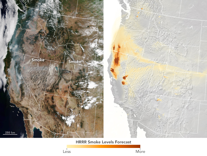 ภาพบนซ้ายมาจาก Visible Infrared Imaging Radiometer Suite(VIIRS) บนดาวเทียม Suomi-NPPแสดงพื้นที่ภาคตะวันตกของสหรัฐอเมริกาในสีธรรมชาติช่วงบ่ายของวันที่ 6 สิงหาคม 2561 ในช่วงเหตุการณ์ไฟป่า the Mendocino Complex Fire สูงสุด ส่วนภาพบนขวาแสดงการจำลองการเคลื่อนตัวของควันไฟป่า (HRRR-Smoke simulation) จากพื้นที่และช่วงเวลาเดียวกัน