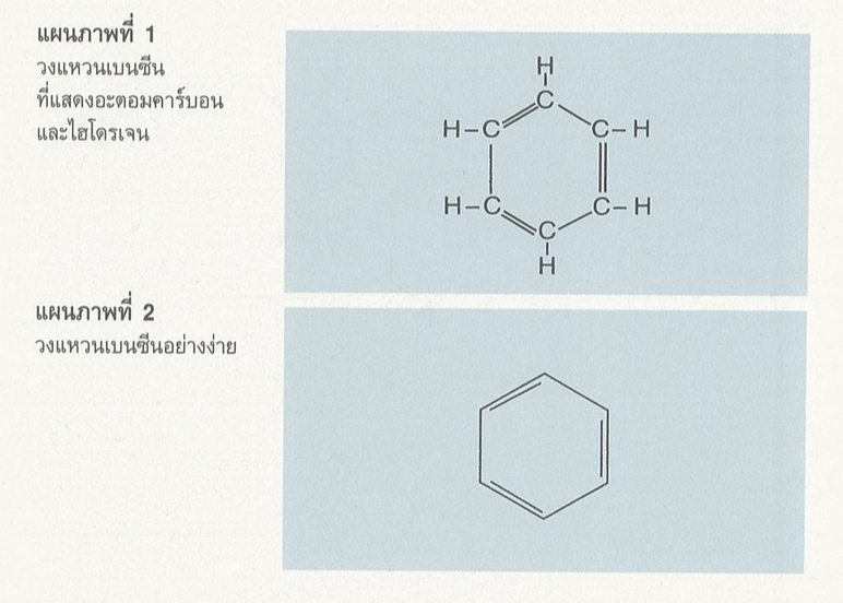 โมเลกุลพื้นฐานของสารเคมีที่มีลักษณะคล้ายไดออกซิน เรียกว่า เบนซีน (benzene) ซึ่งประกอบด้วยคาร์บอน 6 อะตอมและไฮโดรเจน 6 อะตอม เชื่อมกันเป็นวงดังแผนภาพที่ 1โดยทั่วไป คาร์บอนและไฮโดรเจนถูกละไว้ในฐานที่เข้าใจ ดังนั้น วงแหวนของเบนซีนจะเป็นดังแผนภาพที่ 2