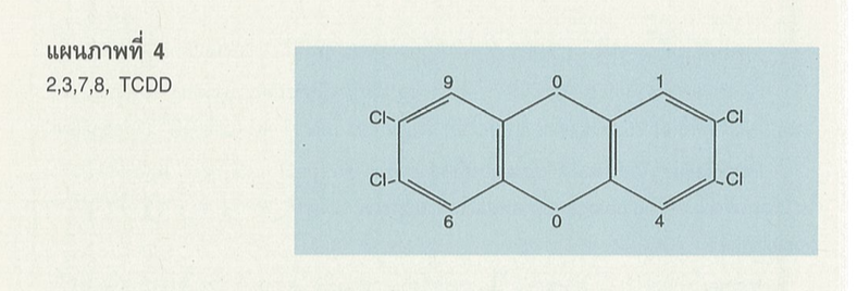 ไดออกซินและสารเคมีที่คล้ายไดออกซินประกอบด้วยวงแหวนของเบนซีน2วงต่อเข้าด้วยกันในแบบใดแบบหนึ่งในจำนวน3แบบ ดังแผนภาพที่ 3