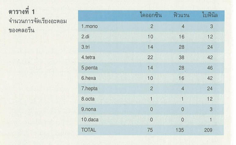 จำนวนของคลอรีน หรือ คลอโร จะระบุโดยคำที่ใช้นำหน้าดังที่อยู่ในตาราง จากตารางแสดงให้เห็นจำนวนของโมเลกุลที่จะมีการเกาะตัวกัน ขึ้นอยู่กับจำนวนและการจัดเรียงตัวของคลอรีน ตัวอย่างเช่น คลอรีน 2 ตัว หรือเรียกว่าไดคลอโร สามารถจัดเรียงในโมเลกุลไดออกซินได้ 10 วิธี ดังนั้น จึงมีไดคลอโรไดเบนโซไดออกซิน (di chloro di benzo di oxin) 10 ตัวที่แตกต่างกัน รวมกันทั้งหมดแล้ว เราพบว่ามีสารประกอบไดออกซินที่แตกต่างกัน 75 ตัว สารประกอบฟิวแรนที่แตกต่างกัน 135 ตัว และสารประกอบพีซีบีที่แตกต่างกัน 209 ตัว