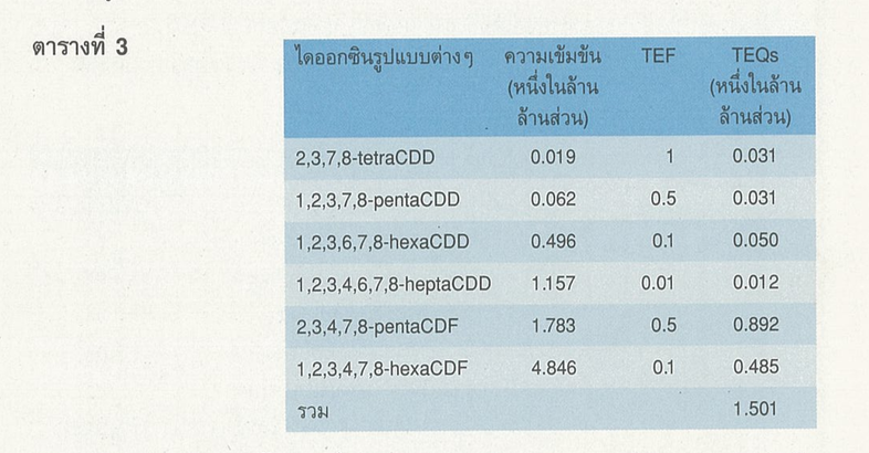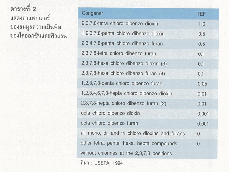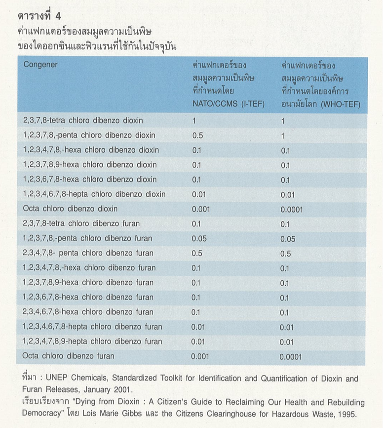 - สมมูลความเป็นพิษ (TEQ)เท่ากับ (ความเข้มข้นของไดออกซิน) X(ค่าแฟคเตอร์ความเป็นพิษ)