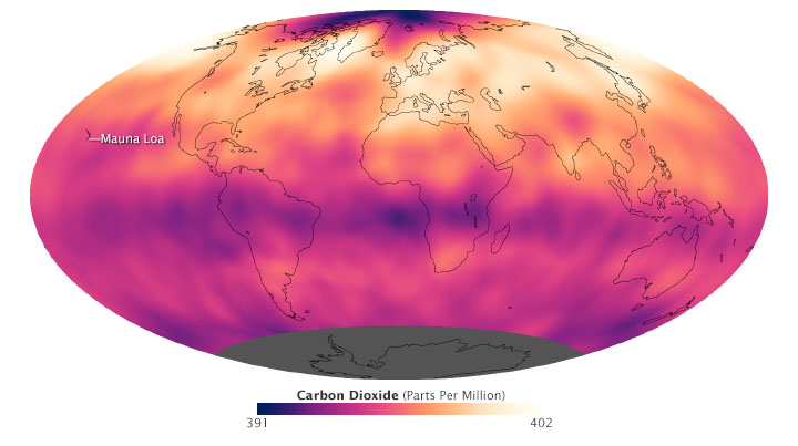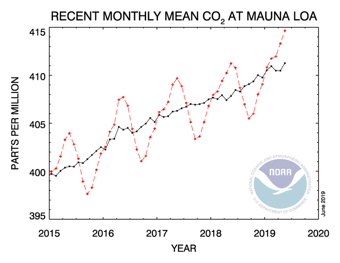ในเดือนพฤษภาคม 2561 เมื่อคาร์บอนไดออกไซด์ในชั้นบรรยากาศมาถึงจุดสูงสุดของปี และกลายเป็นสถิติ ความเข้มข้นของก๊าซเรือนกระจกในเดือนพฤษภาคมคือ 414.7 ส่วนในล้านส่วน(ppm) จากการบันทึกที่หอสังเกตการณ์พื้นฐานด้านบรรยากาศ Mauna Loa ขององค์การบริหารสมุทรศาสตร์และบรรยากาศแห่งชาติสหรัฐอเมริกา(NOAA)ที่ฮาวาย ซึ่งเป็นค่าสูงสุดรายฤดูกาลในช่วง 61 ปี และเป็นปีที่เพิ่มขึ้นอย่างรวดเร็วต่อเนื่องกันเป็นปีที่เจ็ดจากข้อมูลของ NOAA และ the Scripps Institution of Oceanography