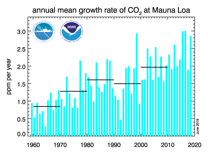 ในแต่ละทศวรรษ ความเข้มของคาร์บอนไดออกไซด์เพิ่มขึ้นในแต่ละปี ในคริสตทศวรรษ 1960 ที่ Mauna Loa สังเกตเห็นการเพิ่มขึ้นประมาณ 0.8 ส่วนล้านส่วนต่อปี จนถึงคริสทศวรรษ 1980s และ 1990s อัตราการเพิ่มกลายเป็น 1.5 ส่วนในล้านส่วนต่อปี และปัจจุบันมากกว่า 2 ส่วนในล้านส่วนต่อปี นาย Pieter Tans นักวิทยาศาสตร์อาวุโสที่ NOAA’s Global Monitoring Division กล่าวว่า มีหลักฐานที่มีอย่างแพร่หลายและสรุปได้ว่า การเพิ่มขึ้นในอัตราเร่งนั้นมาจากการปล่อยก๊าซเรือนกระจกที่เพิ่มขึ้น