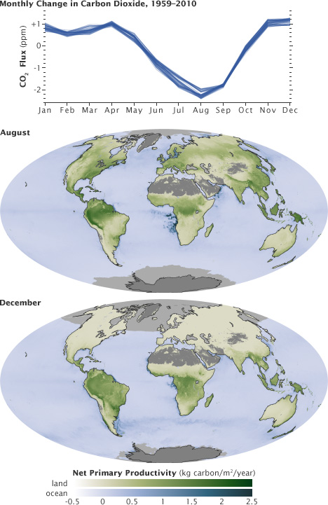 คุณจะสังเกตเห็นว่ามีแบบแผนฟันเลื่อยที่แตกต่างกันในแผนภูมิที่แสดงให้เห็นว่าก๊าซคาร์บอนไดออกไซด์เปลี่ยนแปลงไปอย่างไรเมื่อเวลาผ่านไป ก๊าซคาร์บอนไดออกไซด์มีระดับมากขึ้นและลดลงซึ่งเกิดจากการเปลี่ยนแปลงตามฤดูกาลของพืชพรรณ พืชต้นไม้และพืชผลจะดูดซับก๊าซคาร์บอนไดออกไซด์ดังนั้นฤดูกาลที่มีพืชมากจะมีระดับก๊าซต่ำกว่า โดยทั่วไปความเข้มข้นของก๊าซคาร์บอนไดออกไซด์จะสูงสุดในเดือนเมษายนและพฤษภาคมเนื่องจากการย่อยสลายใบไม้ในป่าทางซีกโลกเหนือ (โดยเฉพาะแคนาดาและรัสเซีย) ได้เพิ่มก๊าซคาร์บอนไดออกไซด์ในอากาศตลอดฤดูหนาวในขณะที่ใบไม้ใหม่ยังไม่แตกหน่อและดูดซับก๊าซได้มากนัก ในแผนภูมิและแผนที่ด้านล่างการลดลงและการไหลของวัฏจักรคาร์บอนสามารถมองเห็นได้โดยการเปรียบเทียบการเปลี่ยนแปลงรายเดือนของก๊าซคาร์บอนไดออกไซด์กับผลผลิตหลักสุทธิในระดับโลก(net primary productivity) ซึ่งเป็นการวัดปริมาณก๊าซคาร์บอนไดออกไซด์ที่พืชใช้ในระหว่างการสังเคราะห์แสงลบด้วยปริมาณที่ปล่อยออกมาระหว่างการหายใจ สังเกตว่าคาร์บอนไดออกไซด์ลดลงในฤดูร้อนของซีกโลกเหนือ