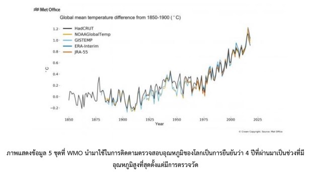จากการเผยแพร่ข้อมูลขององค์การอุตุนิยมวิทยาโลก(World Meteorological Organization: WMO) แสดงให้เห็นว่าปี 2015 2016 2017 และ 2018 เป็น 4 ปีที่มีอุณหภูมิสูงที่สุดตั้งแต่มีการตรวจวัดผลจากการวิเคราะห์ โดย 5 องค์กรระหว่างประเทศชั้นนำแสดงให้เห็นว่าอุณหภูมิพื้นผิวเฉลี่ยทั่วโลกในปี 2018 มีค่าสูงกว่าระดับยุคก่อนอุตสาหกรรม (1850-1900) ประมาณ 1 องศาเซลเซียส