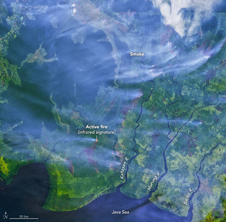 ภาพจากเครื่องมือ MODIS(The Moderate Resolution Imaging Spectroradiometer) บนดาวเทียม Aqua ของนาซา จับภาพเกาะบอร์เนียวในวันที่ 15 กันยายน 2562 ควันไฟป่าทำให้คุณภาพอากาศเลวร้ายมากขึ้นจนต้องมีการประกาศเตือนประชาชนถึงผลกระทบที่จะเกิดขึ้นต่อสุขภาพ จุดเกิดไฟจำนวนมากเกิดขึ้นในกาลิมันตันซึ่งมีพื้นที่มหาศาลเป็นดินป่าพรุ ดาวเทียม/ดูบันทึกภาพหลักฐานการเกิดไฟป่าพรุตลอดช่วงเดือนสิงหาคมที่ผ่านมา แต่จำนวนและความเข้มข้นของไฟป่าพรุขยายเพิ่มขึ้นในช่วงสัปดาห์แรกของเดือนกันยายน