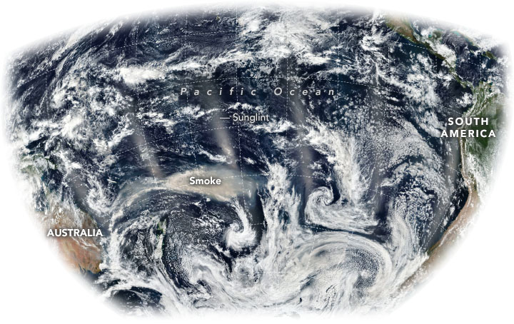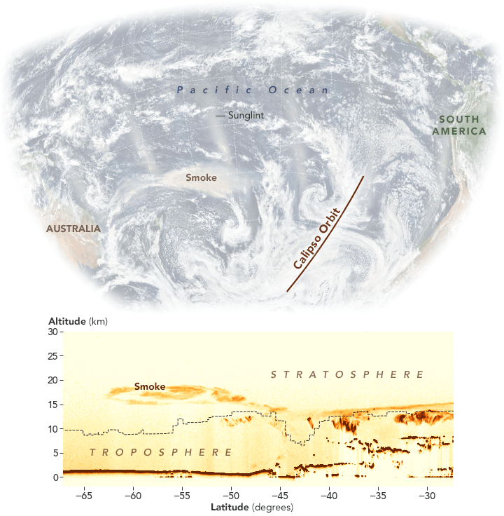 ภาพดาวเทียมในวันที่ 6 มกราคม(ด้านบน) จากเครื่องมือ Visible Infrared Imaging Radiometer Suite (VIIRS) บนดาวเทียม Suomi NPP ทำให้เราเห็นความสูงของฝุ่นและควันที่บันทึกโดยเครื่องมือ Cloud-Aerosol Lidar with Orthogonal Polarization (CALIOP) บนดาวเทียม CALIPSO ภาพตัดขวางแสดงกลุ่มควันไฟบางและยาวข้ามมหาสมุทรแปซิฟิก ส่วนที่เป็นเมฆ(พื้นที่เป็นเฉด เล็กๆ ตรวจพบในระดับที่ต่ำกว่า 14 กิโลเมตร ภาพสีธรรมชาติ sunglint ที่เกิดจากการสะท้อนของแสงทิ้งพื้นที่สว่างในช่วงต่างๆ ภาพด้านล่างมาจากสถานีอวกาศนานาชาติแสดงกิจกรรรมไฟป่ารุนแรงในวันที่ 4 มกราคม 2563