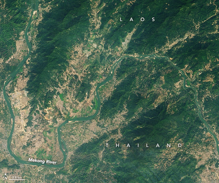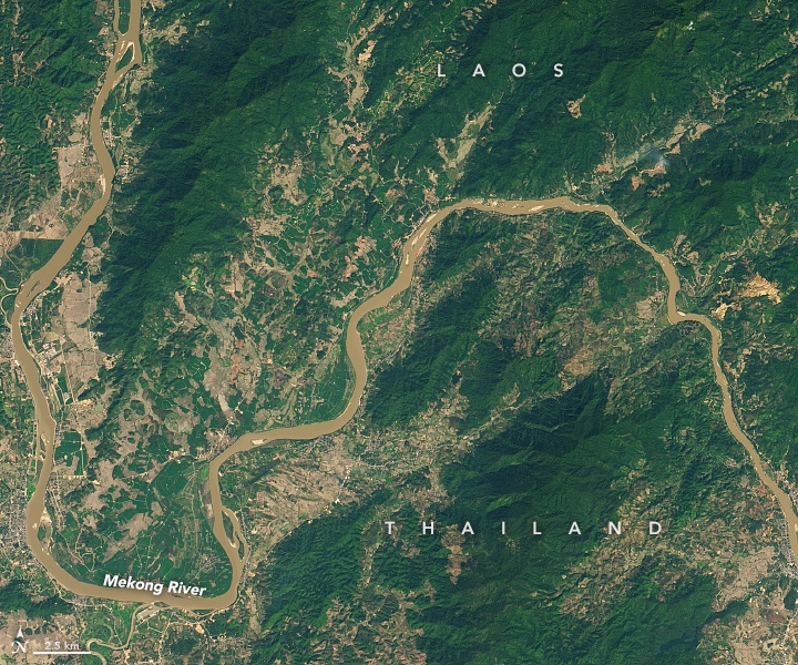 รายงานครั้งแรกของการเปลี่ยนสีแม่น้ำโขงเกิดขึ้นในเดือนพฤศจิกายน 2563 ทางภาคเหนือของไทย และต่อมาขยายไปตามตอนล่างของลำน้ำ ภาพถ่านดาวเทียมสองภาพด้านบนแสดงแม่น้ำโขงบริเวณเมืองห้วยทรายใน สปป. ลาว ภาพบนเป้นแม่น้ำโขงในสภาวะที่มีตะกอนในวันที่ 27 มกราคม 2558 เปรียบเทียบกับสภาพที่เปลี่ยนแปลงไปในวันที่ 25 มกราคม 2563 ทั้งสองภาพบันทึกโดยเครื่องมือ Operational Land Imager (OLI) บนดาวเทียม Landsat 8
