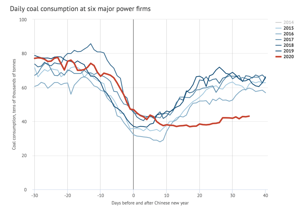 รายงานของ Carbon Brief ระบุว่า ภาคอุตสาหกรรมหลักในจีนดำเนินการในระดับต่ำกว่าปกติในช่วงมาตรการกักตัว เช่น โรงกลั่นน้ำมันในมณฑลกวางตุ้งมีระดับการผลิตที่ต่ำที่สุดนับตั้งแต่ปี พ.ศ.2558 การใช้ถ่านหินในโรงไฟฟ้าก็ต่ำในช่วงสี่ปีที่ผ่านมาโดยเฉลี่ย ผลคือการปล่อยคาร์บอนไดออกไซด์ (CO2) ต่ำลงร้อยละ 25 ในช่วงตรุษจีนเมื่อเทียบกับปี พ.ศ.2562 แต่การปล่อยคาร์บอนไดออกไซด์ (CO2) ในช่วงสองสัปดาห์นั้นทำให้ลดปริมาณการปล่อยในภาพรวมลงได้เพียงประมาณร้อยละ 1