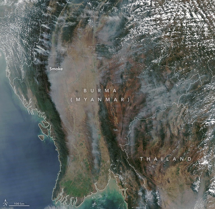 เช่นเดียวกับการติดตามตรวจสอบในช่วงหลายปีที่ผ่านมาในเอเชียตะวันออกเฉียงใต้ การเผาในที่โล่งและไฟป่าก่อให้เกิดหมอกควันปกคลุมทางภาคเหนือตอนของไทยและเมียนมาร์ เครื่องมือ Moderate Resolution Imaging Spectroradiometer (MODIS) บนดาวเทียม Aqua ขององค์การนาซาบันทึกภาพในวันที่ 18 มีนาคม 2563 มลพิษทางอากาศจากหมอกควันอยู่ในระดับที่มีผลกระทบต่อสุขภาพ โดยเฉพาะในเชียงใหม่ ซึ่งเป็นเมืองที่มีมลพิษทางอากาศมากที่สุดในโลกหลายครั้งในเดือนมีนาคมนี้