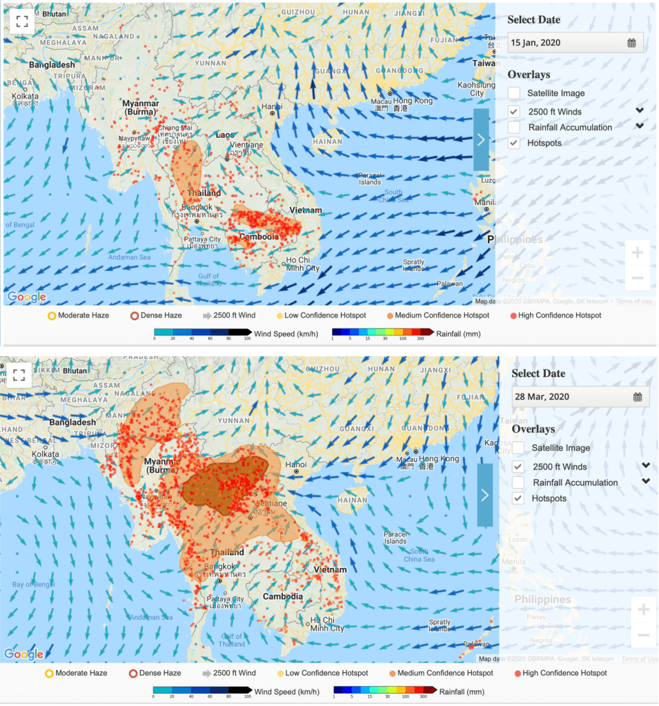 ภาพที่สองแสดงแบบแผนการกระจายตัวของมลพิษทางอากาศในวันที่ 15 มกราคม 2563 และ 28 มีนาคม 2563 โดยเป็นส่วนหนึ่งของการติดตามสถานการณ์มลพิษทางอากาศ จากหมอกควันข้ามพรมแดน (transboundary haze pollution) ของ ASEAN Specialised Meteorological Centre(ASMC) ที่จัดตั้งขึ้นภายใต้ความตกลงอาเซียนว่าด้วยมลพิษทางอากาศ จากหมอกควันข้ามพรมแดน (ASEAN Agreement on Transboundary Haze Pollution) จะเห็นว่าในเดือนมีนาคม 2563 อนุภูมิภาคลุ่มน้ำโขงรวมถึงภาคเหนือตอนบนของไทยต้อง เผชิญกับมลพิษทางอากาศที่มีผลต่อผลกระทบต่อสุขภาพสูงมาก