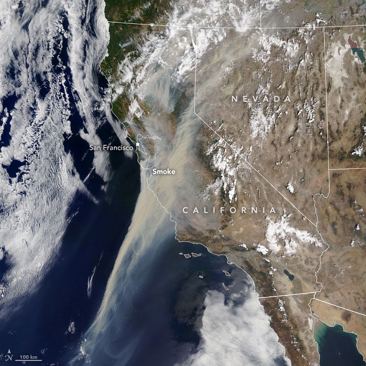 เมื่อไฟป่าลุกลามทางตอนเหนือของแคลิฟอร์เนีย กลุ่มควันไฟป่าจำนวนมากเข้าปกคลุมหลายเมืองในที่ราบหุบเขา San Joaquin และเขตเบย์แอเรียของซานฟรานซิสโก ในวันที่ 19 สิงหาคม 2563 เครื่องมือ Moderate Resolution Imaging Spectroradiometer (MODIS) บนดาวเทียมเทอราขององค์การนาซาจับภาพสีธรรมชาตินี้ไว้ได้ก่อนเวลาเที่ยงวัน
