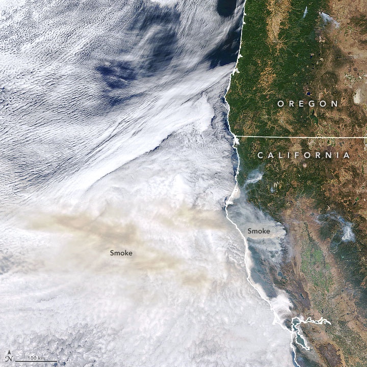 ช่วงสายของวันที่ 2 กันยายน 2563 เครื่องมือ Moderate Resolution Imaging Spectroradiometer (MODIS) บนดาวเทียม Terra ขององค์การนาซาบันทึกภาพสีจริงจากกลุ่มควันไฟป่าแคลิฟอร์เนียที่พัดพาโดยกระแสลมไปทางทิศตะวันตกเหนือมหาสมุทรที่ปกคลุมด้วยเมฆหนา