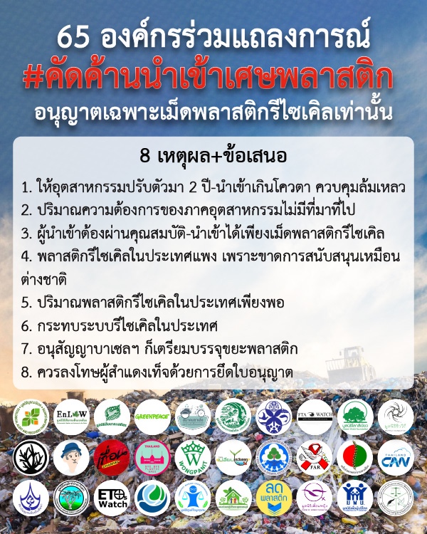 เครือข่ายภาคประชาสังคมมีความห่วงใยต่อประเด็นดังกล่าวที่อาจส่งผลกระทบอย่างมากต่อการแก้ปัญหาขยะภายในประเทศ จึงได้ออกแถลงการณ์เพื่อนำเสนอข้อคิดเห็นและข้อเรียกร้องต่อกระทรวงทรัพยากรธรรมชาติและสิ่งแวดล้อมในฐานะประธานคณะอนุกรรมการบริหารจัดการขยะพลาสติกและขยะอิเล็กทรอนิกส์ ให้ “ยืนยันมติเดิม” ของคณะอนุกรรมการฯ เมื่อปี 2561 ที่ “กำหนดให้ประเทศไทยยกเลิกการนำเข้าขยะหรือเศษพลาสติกและซากอิเล็กทรอนิกส์ 100% ภายในปี 2563” ด้วยเหตุผลและข้อเสนอต่อไปนี้