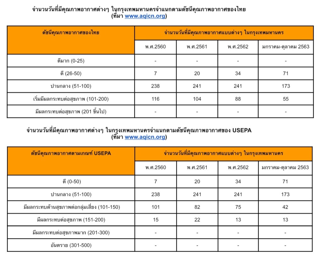 เราได้เห็นหลายพื้นที่ทั่วโลกมีอากาศดีขึ้นในช่วงการแพร่ระบาดของไวรัสโควิด-19 จากการล็อกดาวน์ของหลายเมืองทั่วโลก แต่เมื่อผ่อนคลายมาตรการลง มลพิษทางอากาศกลับมาอีกครั้ง ในกรณีของกรุงเทพฯ วันที่มีอากาศดีเพิ่มขึ้นอย่างเห็นได้ชัดเมื่อเปรียบเทียบกับปีก่อนๆ ดัง 2 ตารางด้านบน