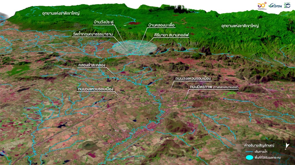 GISTDA ได้ทำการจำลองภาพสามมิติจากภาพดาวเทียม Landsat-8 ซ้อนทับกับข้อมูลแบบจำลองระดับความสูงภูมิประเทศ (DEM) ทำให้เห็นภาพลักษณะภูมิประเทศที่ชัดเจนยิ่งขึ้น ซึ่งด้านบนของภาพเป็นอุทยานแห่งชาติเขาใหญ่ มีเนื้อที่ปกคลุม 2,216 ตารางกิโลเมตร โดยเป็นเทือกเขาสลับซับซ้อน มีระดับความสูงแตกต่างกันตั้งแต่ระดับความสูง 400-1,000 เมตรจากระดับน้ำทะเลปานกลาง ซึ่งพื้นที่ที่ได้รับผลกระทบดังกล่าวอยู่ใกล้บริเวณตีนเขาของอุทยานทำให้ได้รับผลกระทบโดยตรง