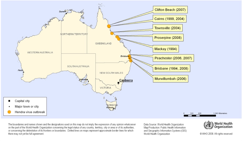 ไวรัสดังกล่าวได้รับการระบุครั้งแรกเมื่อมีการระบาดในเขตเฮนดรา ชานเมืองบริสเบน ออสเตรเลียในปี พ.ศ.2537 ตั้งแต่นั้นมา มีการระบาดอย่างน้อยแปดครั้งตามชายฝั่งทางตอนเหนือของออสเตรเลียตามรายงานของ WHO มีอัตราการเสียชีวิต 50-75%