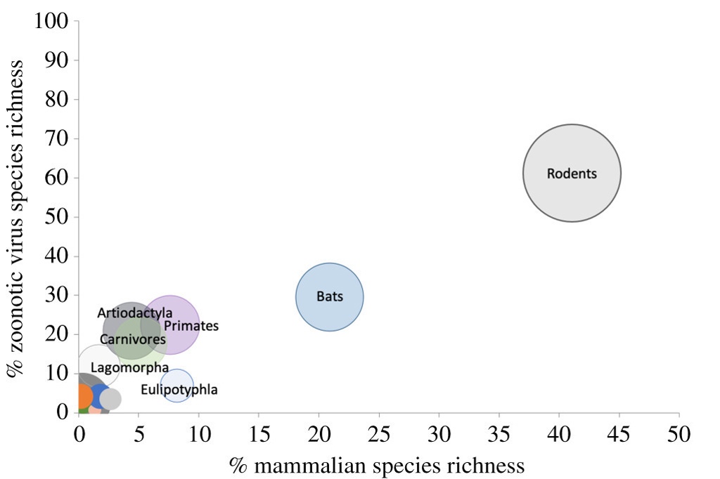 กราฟแสดงให้เห็นว่ากลุ่มสัตว์ฟันแทะมีทั้งจำนวนสายพันธุ์ที่แตกต่างกันมากที่สุดและจำนวนไวรัสที่แตกต่างกันมากที่สุด ตามด้วยค้างคาว และไพรเมต