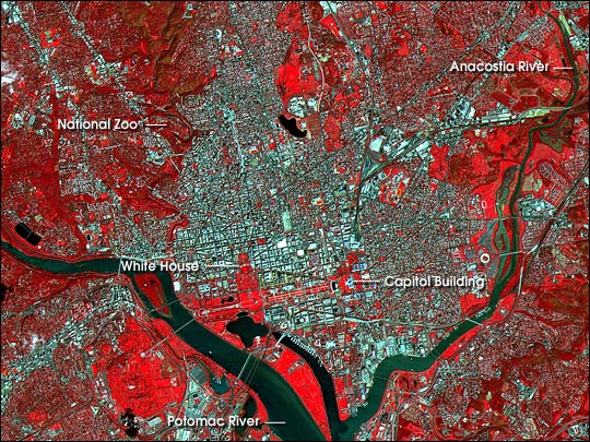 ภาพด้านครอบคลุมพื้นที่กว้าง 14 กม. ยาว 13.7 กม. ในภาพนี้ พืชพรรณจะปรากฏเป็นสีแดง อาคารและถนนลาดยางปรากฏเป็นสีฟ้าอ่อน และน้ำในแม่น้ำ Anacostia และ Potomac เป็นสีเทาเข้ม ความละเอียดเชิงพื้นที่ 15 เมตรของเครื่องมือ ASTER ทำให้เราเห็นอาคารแต่ละหลัง รวมทั้งทำเนียบขาว อนุสรณ์สถานเจฟเฟอร์สัน และอนุสาวรีย์วอชิงตัน