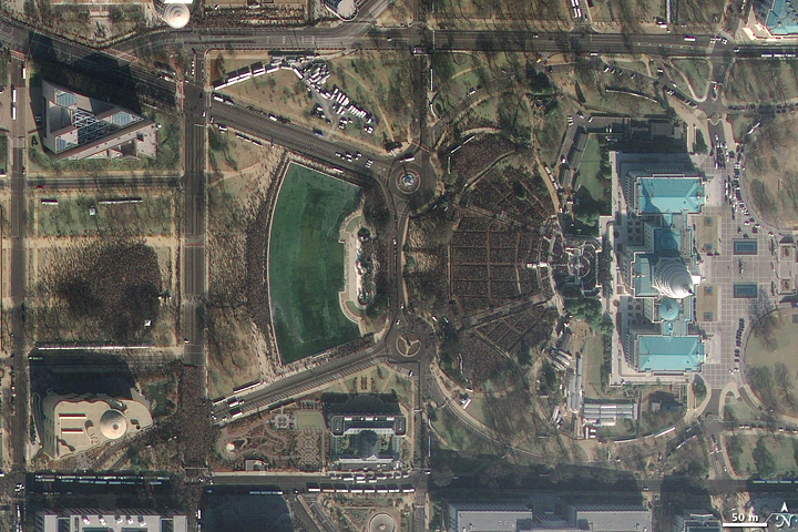 ที่มา : https://earthobservatory.nasa.gov/images/36729/inauguration-day-crowds-in-washington-dc GeoEye เอื้อเฟื้อภาพ คำบรรยายโดย Rebecca Lindsey