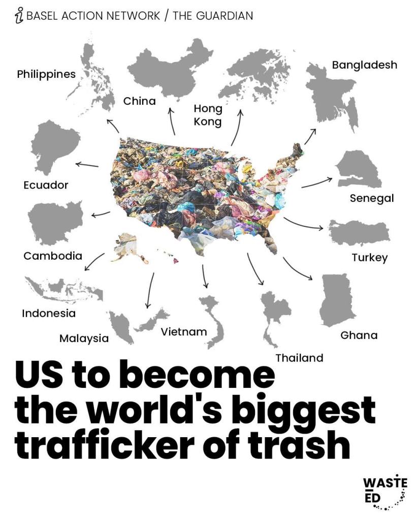 ในขณะที่ 187 ประเทศเห็นชอบที่ควบคุมการค้าขยะพลาสติก แต่สหรัฐอเมริกาไม่มีแผนที่จะหยุดส่งขยะออกนอกประเทศเพราะไม่ได้ให้สัตยาบันในอนุสัญญาบาเซลว่าด้วยการควบคุมการเคลื่อนย้ายข้ามแดนของของเสียอันตรายและการกำจัด (Basel Convention on the Control of Transboundary Movements of Hazardous Wastes and Their Disposal)