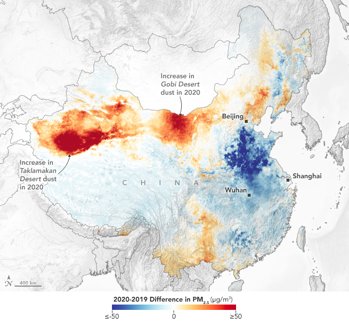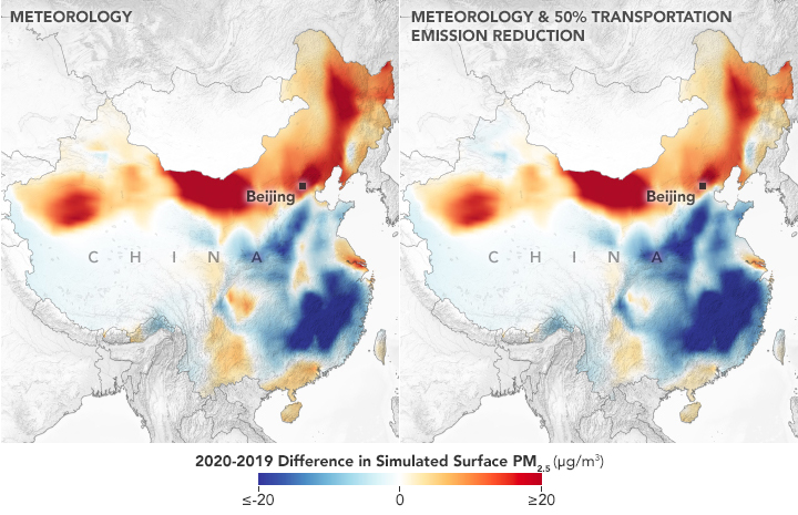 ตัวอย่างในแผนที่ด้านบนซึ่งเปรียบเทียบระดับ PM2.5 ทั่วทั้งจีนในเดือนกุมภาพันธ์ 2563 และกุมภาพันธ์ 2562 ถึงแม้ว่าระดับมลพิษทางอากาศจะลดลงอย่างมากในบางส่วนของพื้นที่ที่มีการพัฒนาอุตสาหกรรมในจีน แต่มลพิษทางอากาศมีระดับสูงกว่าในภูมิภาคที่ติดทะเลทราย การทำแผนที่มลพิษทางอากาศใช้ข้อมูลจากดาวเทียม Terra และ Aqua รวมถึงแบบจำลองทางอุตุนิยมวิทยาจาก NASA Global Modeling and Assimilation Office การศึกษาได้ลงตีพิมพ์ ในวารสาร Science Advances ในเดือนมิถุนายน 2564