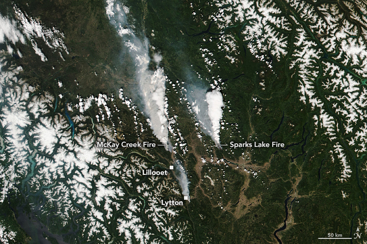 เครื่องมือวัดระบบ Visible Infrared Imaging Radiometer Suite (VIIRS) บนดาวเทียม NOAA-20 จับภาพด้านบนไว้ได้ในช่วงเวลาบ่ายสองโมงตามเวลาท้องถิ่นของวันที่ 30 มิถุนายน 2564 โดยเช้าของวันที่ 1 กรกฎาคม ไฟป่า McKay Creek (ด้านซ้าย) และไฟป่า Sparks Lake (ด้านขวา) เผาผลาญพื้นที่ราว 150 และ 200 ตารางกิโลเมตร ตามลำดับ ไฟป่าที่มีขนาดเล็กกว่าสามารถเห็นได้ในทางตอนใต้ของเมือง Lytton.