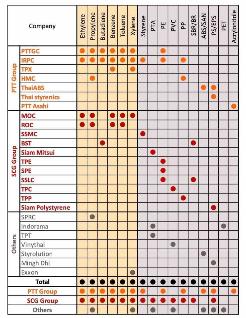 จากการวิเคราะห์โดย Krungsri Research “…ธุรกิจปิโตรเคมีในประเทศมีผู้เล่นหลัก 2 ราย ได้แก่ ปตท. ส่วนแบ่งตลาด 54% และเอสซีจี 29% ทั้งสองได้แข่งขันกันเพื่อให้ได้เปรียบในการแข่งขันด้านการผลิตและการตลาดโดยการลงทุนในธุรกิจที่เกี่ยวข้องอย่างต่อเนื่องทั้งในและต่างประเทศ ปตท.เชื่อมโยงกับอุตสาหกรรมต้นน้ำ ได้แก่ การขุดเจาะน้ำมัน การผลิตก๊าซธรรมชาติ การกลั่นน้ำมัน และการผลิตผลิตภัณฑ์ปิโตรเคมีที่หลากหลาย กลุ่มเอสซีจีมีส่วนได้ส่วนเสียในบริษัทที่ผลิตปัจจัยการผลิตจากปิโตรเคมี เช่น สินค้าอุปโภคบริโภคและวัสดุก่อสร้าง ผู้เล่นระดับรองลงไปยังมีส่วนร่วมในภาคส่วนนี้ด้วย แต่มีแนวโน้มที่จะมุ่งเน้นไปที่การผลิตสินค้าขั้นกลางและปลายน้ำ ได้แก่ บริษัทไทย เช่น Vinythai และผู้ประกอบการต่างประเทศหรือการร่วมทุนกับบริษัทต่างประเทศ เช่น Indorama, Exxon และ MingDih…”