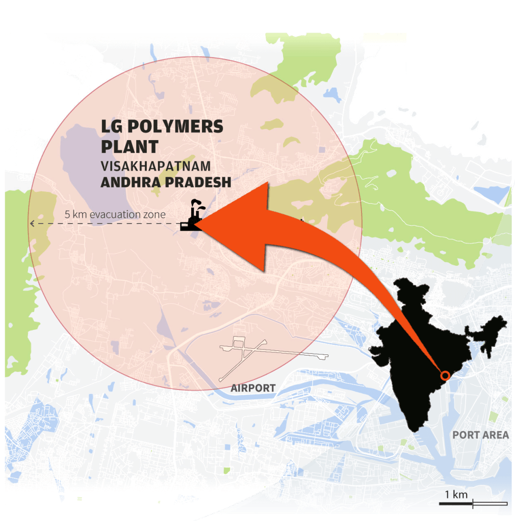 สไตรีนเป็นสารประกอบอินทรีย์ที่ใช้ในการผลิตโพลีเมอร์/พลาสติก/เรซิน ผลิตขึ้นในโรงกลั่นปิโตรเคมีและมีแนวโน้มว่าจะเป็นสารก่อมะเร็ง มันสามารถเข้าสู่ร่างกายผ่านการหายใจ แต่ยังผ่านทางผิวหนังและดวงตา ตามกฎการผลิต การจัดเก็บ และการนำเข้าของอินเดียว่าด้วยสารเคมีอันตรายปี 1989 สไตรีนจัดเป็น “สารเคมีอันตรายและเป็นพิษ” การสัมผัสกับสไตรีนในมนุษย์ในระยะสั้นส่งผลให้เกิดการระคายเคืองในเยื่อเมือกและตา และปัญหาทางเดินอาหาร การได้รับสารเป็นเวลานานส่งผลกระทบต่อระบบประสาทส่วนกลาง นำไปสู่อาการปวดหัว อ่อนเพลีย อ่อนแรง ซึมเศร้า ทำงานผิดปกติ สูญเสียการได้ยิน และเส้นประสาทส่วนปลาย หากความเข้มข้นของสไตรีนเกิน 800 ppm บุคคลที่สัมผัสกับสไตรีนอาจเข้าสู่อาการโคม่าได้ ผู้เชี่ยวชาญกล่าวว่าทันทีหลังจากการรั่วไหล ระดับอาจสูงถึง 1,000 ppm ในพื้นที่ใกล้เคียง ซึ่งเป็นสาเหตุที่ผู้คนเริ่มเป็นลม