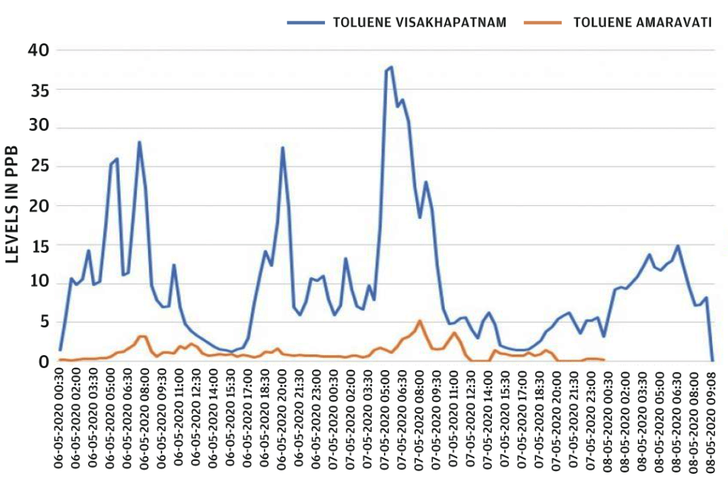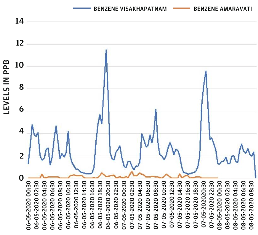 ค่าที่วัดได้สูงกว่าระดับที่บันทึกไว้ในเมืองอมราวตี เมืองหลวงของรัฐอานธรประเทศ ซึ่งตั้งอยู่ประมาณ 400 กม. ทางใต้ของเมืองไวแซกในช่วงเวลาเดียวกัน ข้อมูลในอดีตชี้ให้เห็นถึงระดับของ VOCs ที่สูงเป็นปรากฏการณ์ปกติในอากาศแวดล้อมที่เมืองไวแซก มาตรฐานสำหรับไฮโดรคาร์บอนในอากาศแวดล้อมคือ 5 ppb (ค่าเฉลี่ยรายปี) ตามมาตรฐานคุณภาพอากาศแวดล้อมของคณะกรรมการควบคุมมลพิษกลาง(CPCB)