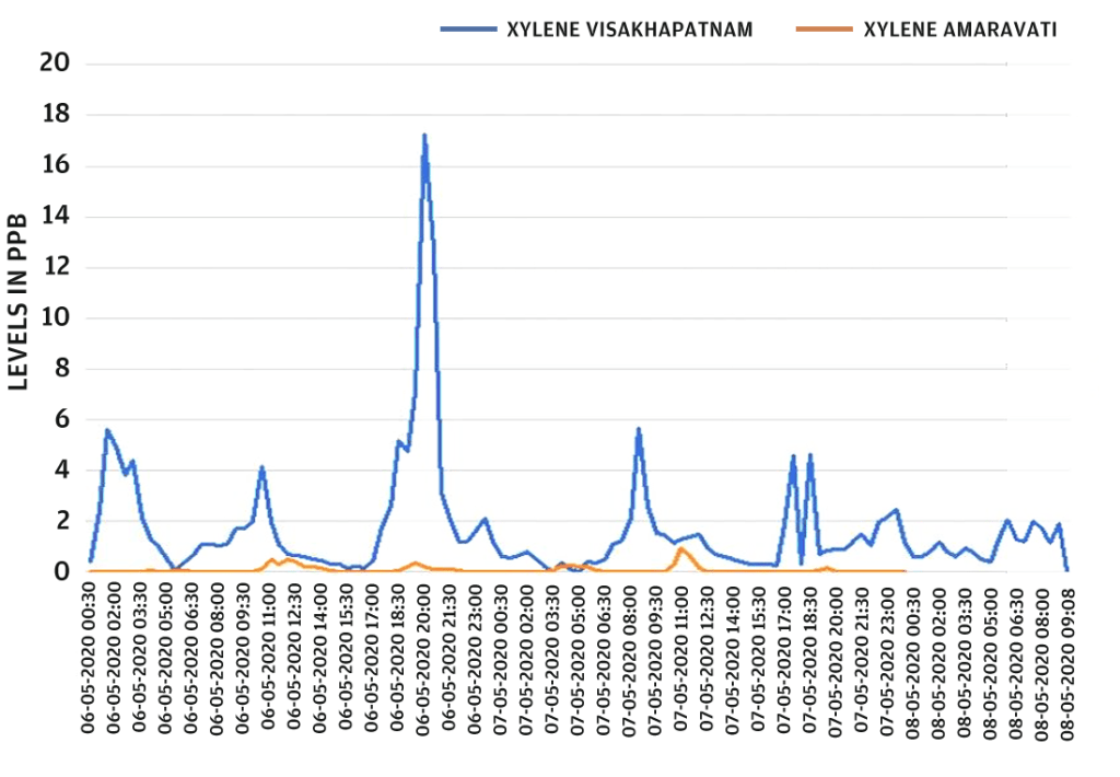 เครือข่ายสถานีวัดคุณภาพอากาศแบบเรียลไทม์ของคณะกรรมการควบคุมมลพิษกลาง (CPCB) ตรวจวัดสารประกอบอินทรีย์ระเหยง่าย (VOCs) สามชนิด – ไซลีน (C8H10), เบนซีน (C6H6), โทลูอีน (C7H8) – ในเขตไวแซก และจุดใต้ลม 14 กม. จากศูนย์กลางการรั่วไหลของก๊าซพิษ