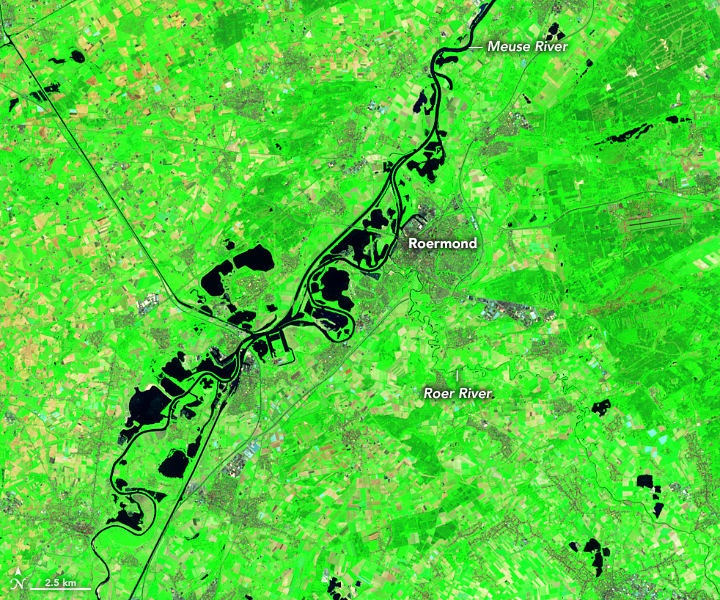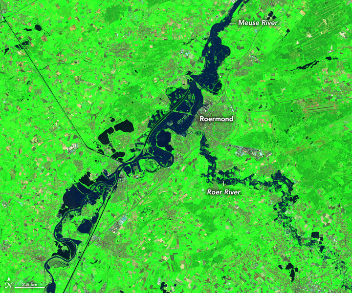 ในวันที่ 18 กรกฎาคม 2564 เครื่องมือ Operational Land Imager (OLI) บนดาวเทียม Landsat 8 จับภาพเหตุอุทกภัยตามแม่น้ำมิวส์และแม่น้ำโรเออร์ เมื่อระดับน้ำในแม่น้ำเอ่อท่วม ผู้คนราว 5,000 คนถูกบังคับให้อพยพออกจากเมืองโรมอนด์ เมืองหนึ่งในเนเธอร์แลนด์ใกล้ชายแดนเยอรมนี เขื่อนแตกบนแม่น้ำ Roer มีส่วนทำให้เกิดน้ำท่วมอย่างกว้างขวาง