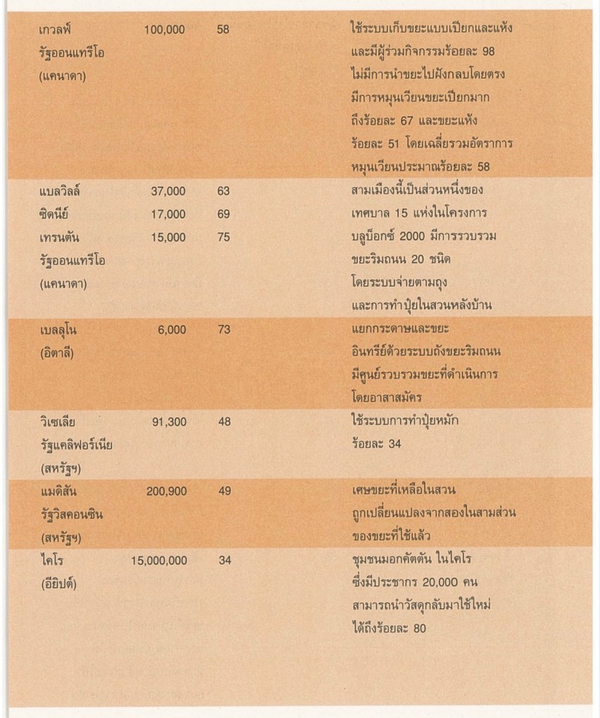 3. ประยุกต์วิธีจัดการขยะให้เข้ากับวิถีชุมชน -ในแต่ละชุมชนมักจะมีคนจำนวนไม่น้อยที่กระตือรือร้นเข้ามามีส่วนร่วมในการจัดการปัญหานี้ ความตั้งใจและการให้ความร่วมมือของคนเหล่านี้ในชุมชนจะทำให้การจัดการขยะมีประสิทธิภาพมากขึ้น ยิ่งไปกว่านั้น การเลือกวิธีจัดการขยะที่เหมาะสมกับแต่ละชุมชนจะช่วยส่งเสริมให้โครงการด้านสังคมของชุมชนดำเนินไปได้ดีขึ้นด้วย เช่น การให้บริการผู้สูงอายุในชุมชน การช่วยเหลือผู้พิการ โครงการฝึกงานสมาชิกในชุมชน โครงการสวนสาธารณะชุมชน และกิจกรรมการสร้าง ความเป็นชุมชนต่าง ๆ ผมเห็นว่า การพัฒนาชุมชนเป็นยาแก้โรค ”บริโภคนิยม” ซึ่งก่อให้เกิดขยะมากขึ้นโดยไม่จำเป็น