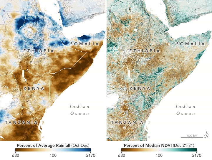 NASA Earth Observatory images by Joshua Stevens, using data from the Climate Hazards Center, the Famine Early Warning System Network (FEWS Net), and modified Copernicus Sentinel data (2021) processed by the European Space Agency courtesy of Josh Willis/NASA/JPL-Caltech. Story by Michael Carlowicz.