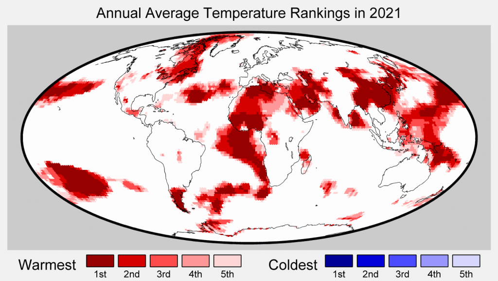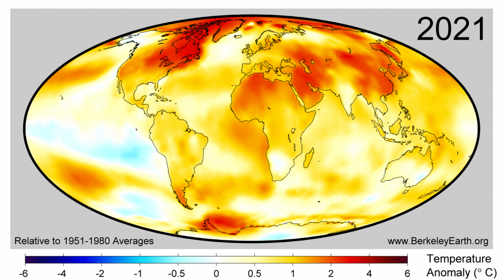 “เราประมาณการว่า 8.3 % ของพื้นผิวโลกสร้างสถิติใหม่ในระดับพื้นที่สำหรับค่าเฉลี่ยอุณหภูมิรายปีที่ร้อนที่สุด” ดร.โรเบิร์ต โรห์เด หัวหน้านักวิทยาศาสตร์ของเบิร์กลีย์กล่าว “ในปี 2564 ไม่มีที่ใดในโลกที่มีค่าเฉลี่ยความหนาวเย็นเป็นประวัติการณ์”