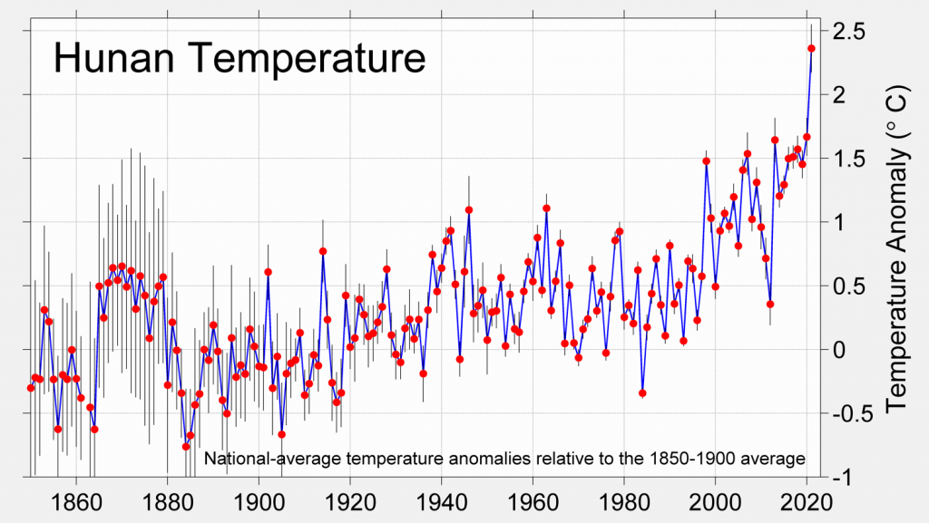 ในประเทศจีน มณฑลหูหนานทำลายสถิติเฉลี่ยประจำปีเกือบ 0.7°C (1.3°F) เหนือสถิติก่อนหน้านี้ที่เพิ่งตั้งไว้ในปี 2563 ซึ่งเป็นขอบเขตที่สูงสุดโดยสถิติประจำปีนั้นเกินกว่าพื้นที่ใดๆ ในโลกในปี 2564