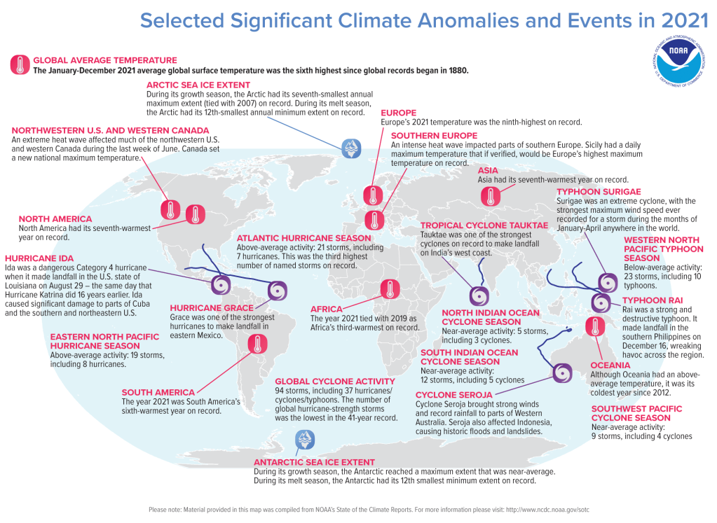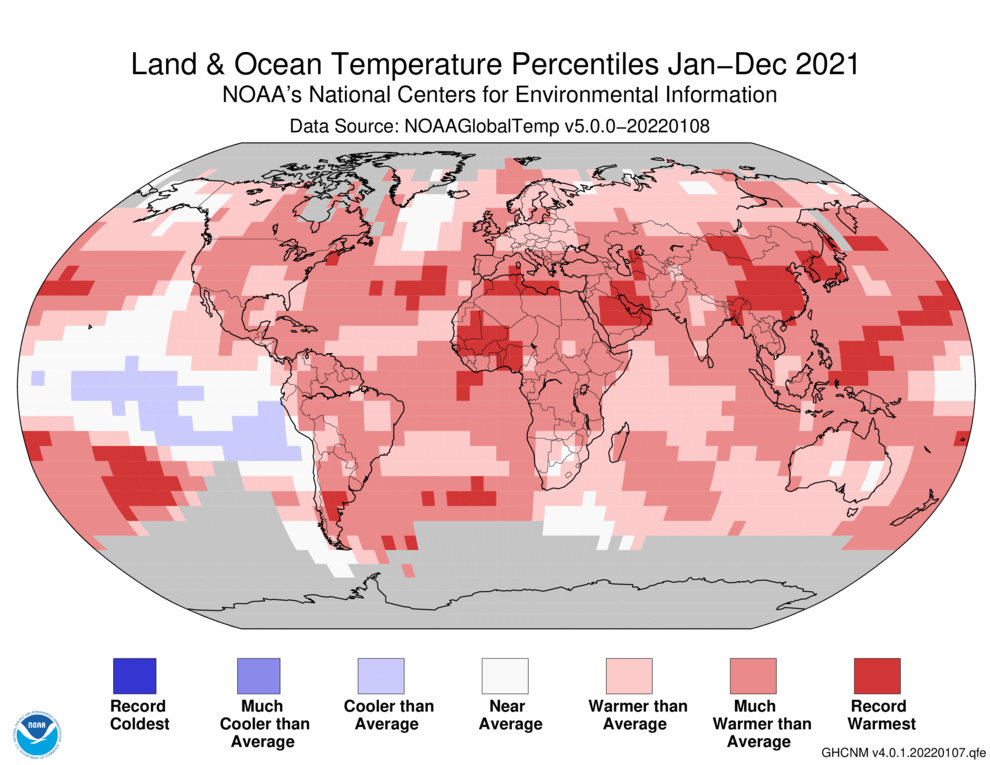 จากการวิเคราะห์โดยนักวิทยาศาสตร์ที่ศูนย์ข้อมูลสิ่งแวดล้อมแห่งชาติของ NOAA (NCEI) ปี 2564 อยู่ในอันดับที่ 6 ในรายการปีที่ร้อนที่สุดเป็นประวัติการณ์ เทียบย้อนหลังไปถึงปี 2423