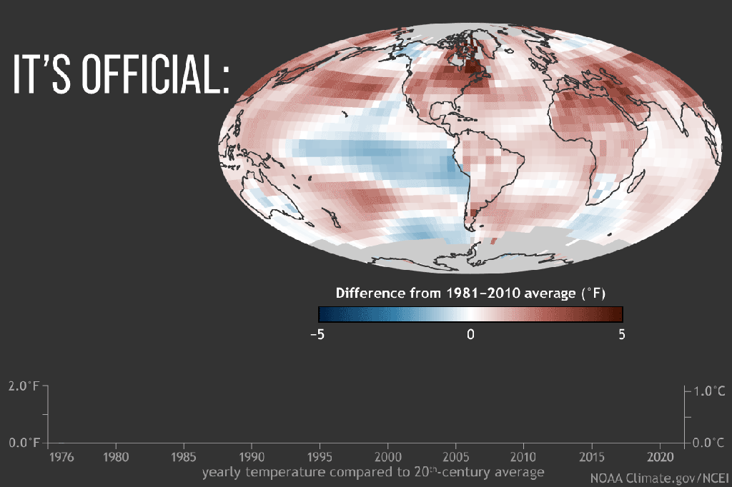 อุณหภูมิพื้นดินและพื้นผิวมหาสมุทรโดยเฉลี่ยของโลกในปี 2564 อยู่ที่ 1.51 องศาฟาเรนไฮต์ (0.84 องศาเซลเซียส) สูงกว่าค่าเฉลี่ยในศตวรรษที่ 20